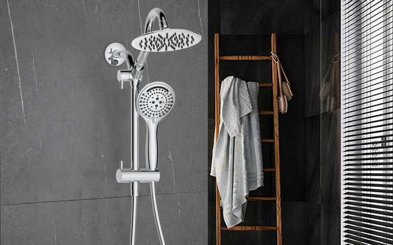 上出水彎管套裝;頂噴內(nèi)置球頭,可實(shí)現(xiàn)多角度旋轉(zhuǎn)調(diào)整;把手切換頂噴出水、花灑出水;轉(zhuǎn)動(dòng)把手調(diào)節(jié)滑座高低