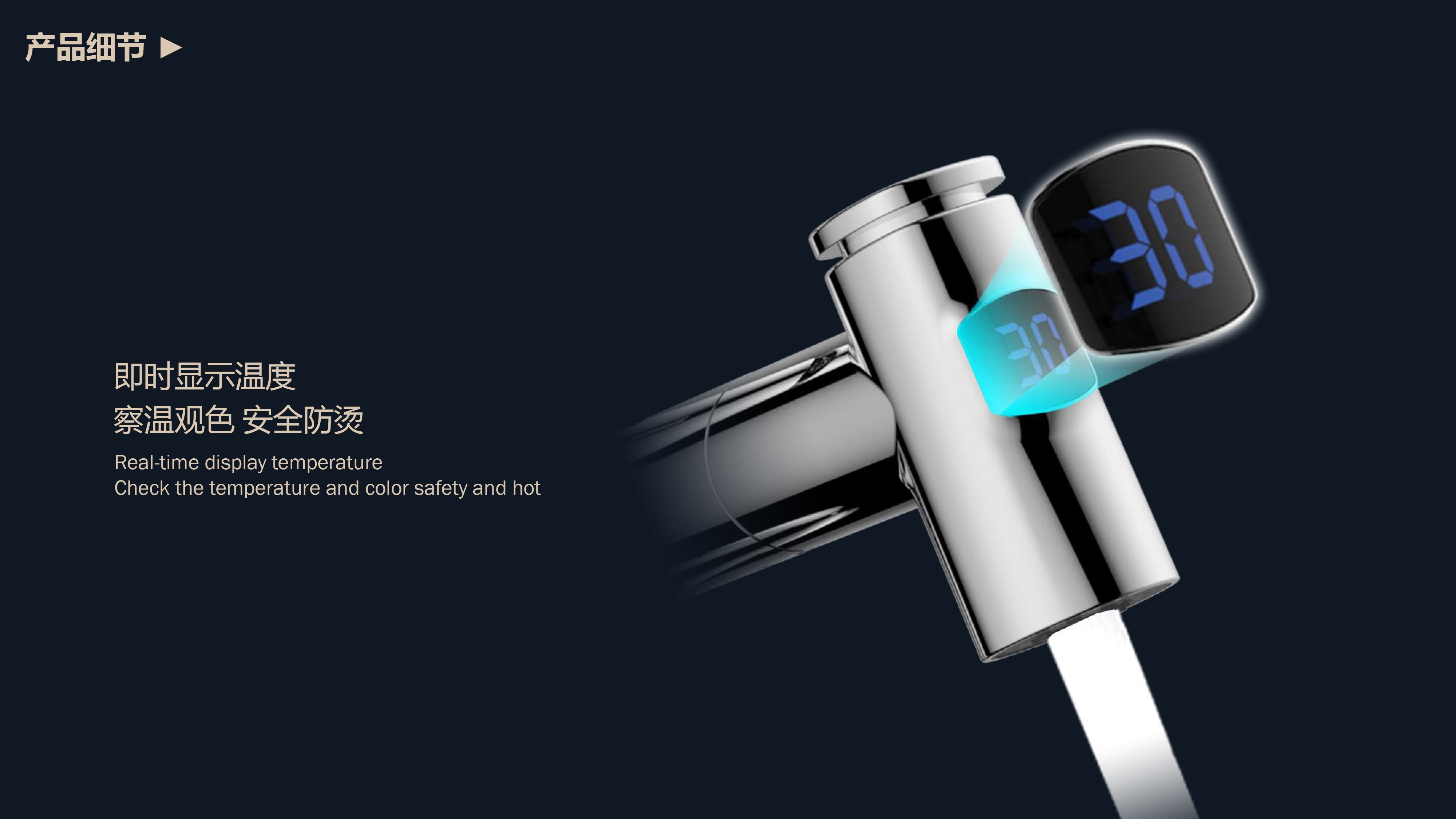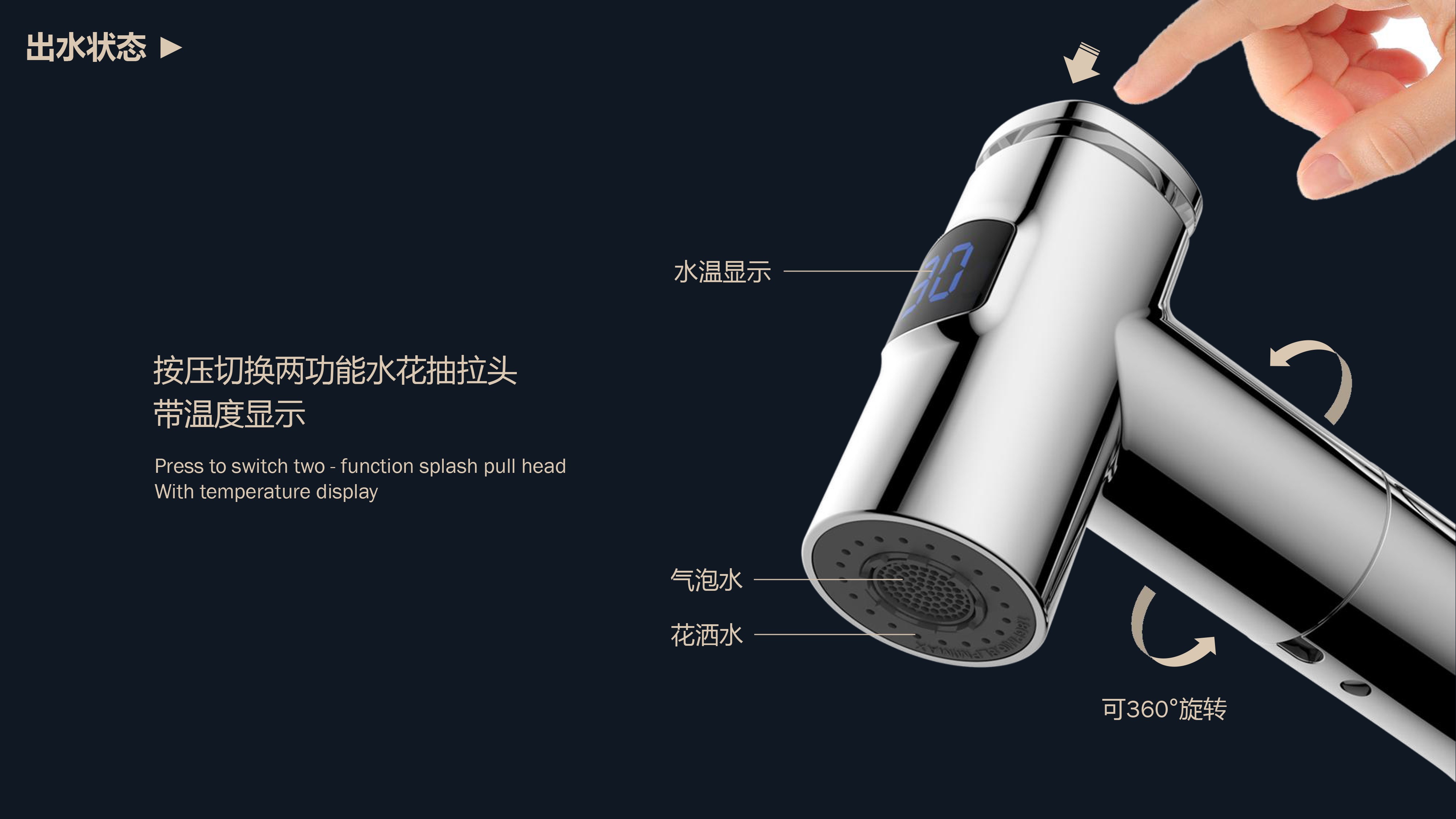 即時(shí)顯示溫度,安全防燙;日常洗頭利器,抽拉出水輕松洗;按壓切換兩功能水花;適合4寸3孔安裝臺(tái)面